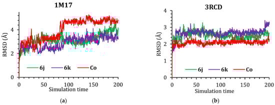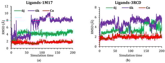 In the case of the 3RCD, compound 6j showed stable behavior inside the active site till around 140 ns of the simulation time with RMSD 3.00 Å; next, the compound was moved by around 5.00 Å with regards to its original position and kept fluctuating till the end of the simulation time. Compound 6k, on the other hand, showed a fluctuation from the beginning to the end of the simulation in the range of 4.00–5.00 Å with respect to its original position; it was not able to hold position inside the active and continuously changed orientation. The co-crystal ligand was stable inside the active site of the 3CRD and fluctuated in the range of 2.00 Å during the simulation. In addition, Figure 5b presents the RMSD of ligands inside the active site of 3RCD.