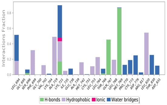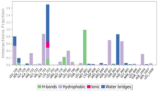 In the case of 3RCD (Figure 8), compound 6j showed a strong H-bond whit MET801 (100%) interactions followed by SER783 (30%) and LYS753 (18%). Additionally, strong hydrophobic interactions with ALA751 (85%), LEU852 (80%), PHE864 (75%), and LEU726 (55%) were observed. Furthermore, H2O-bridged H-bond interactions with LYS753 (85%) and ASP863 (80%), the hydrogen bond interactions are shown in Figure 9. Briefly, MD simulations revealed that compound 6j might work via inhibition of 1M17 or 3RCD or maybe both. The conformation of the protein changes little to best fit the compound inside the active site, with the hinge playing a critical role in this conformational change (Figure S2).