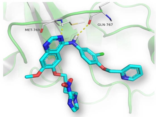 As demonstrated in Figure 2, the rational design of the new candidates comes with three aniline patterns at C-4 of the quinazoline core to be directed into the deep hydrophobic pocket into the binding site, including the 3-chloro-4-(pyridin-2-ylmethoxy)aniline moiety of neratinib (2020 FDA-approved EGFR/HER2 dual inhibitor), quinolin-6-amine, and 4-aminobenzonitrile. To attain higher affinity and potency of the newly synthesized small molecules (6a–l), C6 and C7 positions were subjected to a variety of different polar/solubilizing functional groups. Indeed, gefitinib methoxy moiety was presented in all new derivatives to enhance their solubilizing properties. Furthermore, to investigate the effect of the nitroimidazole-1H-alkyloxyl moiety at the C6 position of the quinazoline core, the integration of various alkoxy spacers with different lengths was applied. The substitution patterns in the new series were planned to enhance the potency as well as selectivity via the integration of new moieties at C6 of the substituted 4-anilinoquinazolines and/or by changing the C4 aniline moieties. The new small molecules were assessed over EGFR and HER2 kinases in a single dose percent inhibition mode. The most active compound was further assessed for its IC50 values over both isoforms. A small kinase panel was then applied to check the selectivity of the most potent compound. In addition, detailed simulation studies were performed to understand the binding affinities and alignment of the new compounds at the ATP binding site of both kinases.