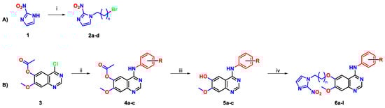 As shown in Scheme 1, a new series of lapatinib derivatives 3a–l was synthesized. First, to synthesize the 1-(n-bromoalkyl)-2-nitro-1H-imidazoles (2a–d, Scheme 1A), the commercially available 2-nitroimidazole (1) was used. The incorporation of the bromoalkyl chain into the 2-nitroimidazole was accomplished in DMF solvent using a variety of commercially available 1,n-dibromoalkanes, and K2CO3 as a catalytic inorganic base at 60 °C. Second, as illustrated in Scheme 1B, the commercially available 4-chloro-7-methoxyquinazolin-6-yl acetate (3) was refluxed in isopropyl alcohol separately, with three different aniline moieties that substituted the chloro group on the C4 position of the quinazoline chemical scaffold: quinolin-6-amine, 4-aminobenzonitrile, and 3-chloro-4-(pyridin-2-ylmethoxy)aniline to form intermediates 4a–c. Intermediates 5a–c were then formed via a hydrolysis reaction of the ester group of compounds 4a–c. The hydrolysis reaction was performed using an aqueous ammonia solution (28%) in methanol solvent at room temperature. The free phenolic group in intermediates 5a–c was then reacted with the previously synthesized 1-(n-bromoalkyl)-2-nitro-1H-imidazoles (2a–d) in DMF solvent in the presence of potassium carbonate at 80 °C to yield the target lapatinib derivatives 6a–l (Table 1).