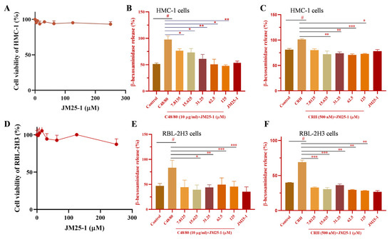 JM25-1 inhibits MC degranulation at safe concentration. (A) HMC-1 cells were treated with JM25-1 (0, 3.9, 7.8125, 15.625, 31.25, 62.5, 125, 250 μM) for 24 h and the cell viability was detected by CCK-8 assay. HMC-1 were pretreated with JM25-1 for 10 min (B) in C48/80 or (C) CRH-induced degranulation for 15 min. (D) RBL-2H3 cells were treated with JM25-1 (0, 3.9, 7.8125, 15.625, 31.25, 62.5, 125, 250 μM) for 24 h and the cell viability was detected by CCK-8 assay. RBL-2H3 were pretreated with JM25-1 for 10 min (E) in C48/80 or (F) CRH-induced degranulation for 15 min. The data are presented from at least three independent experiments run in triplicate. Bars, S.D. # p ≤ 0.05 vs. the Control; * p ≤ 0.05, ** p ≤ 0.01, *** p ≤ 0.001 vs. the C48/80 or CRH group.
