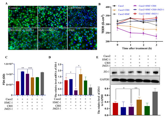 Caco2 cells (5 × 105 cells/mL) and HMC-1 cells (5 × 105 cells/mL) were seeded to the Transwell® Flters (0.4 μm pore size, Corning, NY, USA) and basolateral compartment of the Transwells, respectively. After 21 to 23 days, Caco2 established a differentiated and polarized monolayer, which was co-cultured with HMC-1. In parallel, Caco2 cells were also co-cultured in IMDM medium without HMC-1 as blank (labeled as Caco2) to exclude the possibility that the medium change already causes a change in paracellular permeability. The integrity of Caco2 monolayers was affected by HMC-1 cells treated with CRH (500 nM) or JM25-1 (31.25 μM), and measured with an epithelial volt-ohm meter (Millicell® ERS-2, Merck, Darmstadt, Germany). During the subsequent 3 h, the TEER value was monitored per to evaluate the resistivity. The resistivity was calculated by the formula: Resistivity (Ω·cm2) = (Ohm − Ohm0) × A; Ohm0: resistance value of the insert with culture medium only; Ohm: resistance value of the insert with cells; A: surface area of insert.