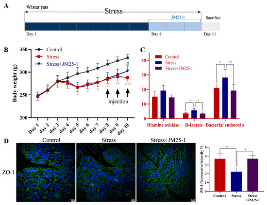 JM25-1 repairs intestinal permeability in stress induced rats. (A) Modeling method. (B) Body weight of rats after treatment with JM25-1 (i.p. every day, 15 mg/kg, n = 7); bar, S.D. * p ≤ 0.05, ** p ≤ 0.01, *** p ≤ 0.001 vs. the Control group. # p ≤ 0.05 vs. the Stress group (C) the level of diamine oxidase, D-lactic acid and bacterial endotoxin in serum on day 11. bars, S.D. * p ≤ 0.05, ** p ≤ 0.01; (D) immunofluorescence staining of ZO-1 in intestine. Bar = 20 µm, magnification 200×. bars, S.D. * p ≤ 0.05.