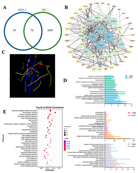 The effect of JM25-1 on IBS was discussed based on network pharmacology. (A) Venn diagram of JM25-1 targets and IBS targets. (B) Protein–protein interaction (PPI) network of bioactive compounds of JM25-1 against IBS. (C) Visualization of molecular docking between JM25-1 and IBS. (D) GO enrichment analysis of core target for JM25-1 against IBS, including biological process, cellular components and molecular function. (E) Top 30 enriched KEGG pathways of core target for JM25-1 against IBS. The color scales indicate the different thresholds of adjusted p-values, and the sizes of the dots represent the gene count of each term.
