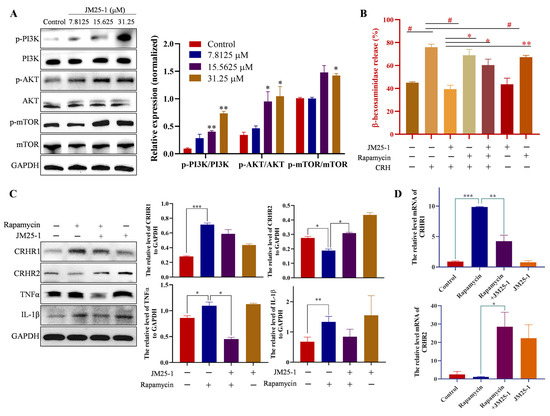 2.8. JM25-1 Regulates CRHR Expression and Activation of MC through the PI3K/AKT/mTOR Signaling Pathway