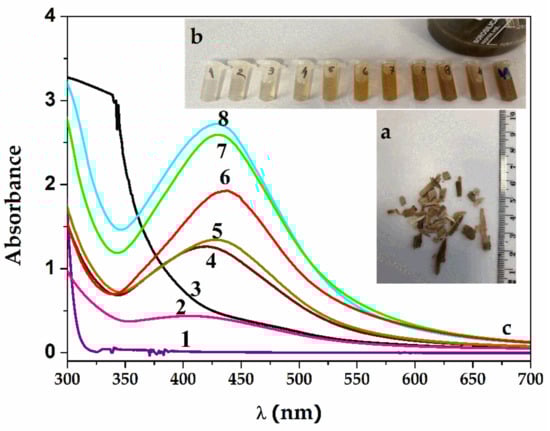 (a) Salix alba L. bark was collected in Dâmboviţa County, Romania, from willow trees. (b) Color change of the solution from yellow to dark brown. (c) UV–Vis spectra of SAgNP-WT samples obtained by reduction in time with willow aqueous extract: 1—AgNO3 0.5 mM; 2—SAgNPs-WT 1S (after 5 min); 3—willow extract; 4—SAgNPs-WT 4S (after 10 min); 5—SAgNPs-WT 5S; 6—SAgNPs-WT 7S; 7—SAgNPs-WT 9S; and 8—SAgNPs-WT 10S.