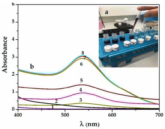 (a) Samples collected during gold bioreduction with the appearance of the purple–violet final color; (b) UV–Vis spectra of SauNP-WT samples obtained by reduction in time with willow aqueous extract: 1—0.1 mM HauCl4x3H20; 2—willow extract (after 5 min); 3—SauNPs-WT 1S; 4—SauNPs-WT 4S; 5—SauNPs-WT 5S; 6—SauNPs-WT 7S; 7—SauNPs-WT 9S; and 8—SauNPs-WT 10S.