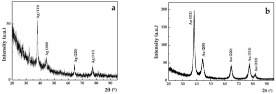 The experimental peaks were located at 38.25°, 44.63°, 64.80°, 77.79° and 81.90°, which correspond to the (111), (200), (220), (311) and (222) Bragg reflections for SAuNPs-WT. Meanwhile, for SAgNPs-WT, the experimental peaks were located at 38.03°, 44.35°, 64.37° and 77.37°. These experimental peaks correspond to gold and cubic silver, respectively, as indexed by the ICDD database with cards no. 001-1172 and 001-1164. Qualitatively, it can be observed that the full width half maximum (FWHM) of the (111) diffraction peak decreases from 1.54° for AuNPs to 0.55° for SAgNPs-WT (Figure 3a,b). From a quantitative point of view, the decrease in the peak width is correlated with an increase in the mean crystallite size, according to the Debye–Scherrer equation. A size of 5.67 nm was found for Au-NPs, while Ag-NPs exhibited larger mean crystallite sizes (16.12 nm). The presence of XRD peaks and mean crystallite sizes of several nm indicate that the synthesized NPs were nanocrystalline.