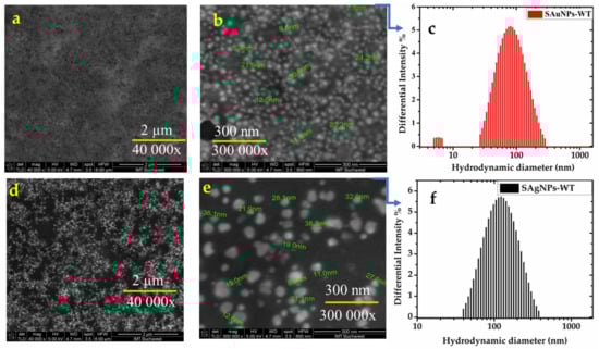SEM images at different magnitudes and hydrodynamic diameters determined by DLS: (a)—SAuNPs-WT (40,000×); (b)—SAuNPs-WT (300,000×); (c)—DLS of SAuNPs-WT; (d)—SAgNPs-WT (40,000×); (e)—SAgNPs-WT (300,000×); and (f)—DLS of SAgNPs-WT.
