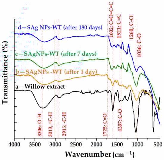 The 1395 band confirms the existence of phenolic compounds. Meanwhile, the 1240 band can be attributed to the vibration mode of C–O bonds involved in the guaiacol rings or syringyl rings from tannins, while the band at 1036 can be associated to the mode of deformation of C–O bonds from alcohols or aliphatic ethers. Comparing the synthesis sample spectra of silver nanoparticles (Figure 5b–d) with the willow extract spectrum, a change in the spectrum below 700 was observed, thus, confirming the formation of Ag nanoparticles to which the willow groups are anchored. The anchoring of organic molecules to silver nanoparticles is confirmed by the presence of bands in the 4000–700 region. These bands are slightly shifted compared to the spectral bands for the willow sample, and it can be said that the silver nanoparticles present in the FT-IR spectrum exhibit vibrations characteristic of the alcohols and phenolic groups from the willow extract anchored by the nanoparticles. The peak reduction after 1 day of synthesis at about 3300, 2915 and 1700 , simultaneously with the disappearance of the band at 1700 and 1440 after 7 days, confirms the involvement of hydroxyl and carbonyl groups in the reduction in salts and the stabilization of silver nanoparticles. For the samples recorded at the 180-day mark, the stability of the synthesized nanomaterials is confirmed. Thus, it can be said that willow acts as both a reducing and a capping agent [,,,].