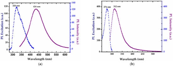 Photoluminescence excitation (PLE) and emission (PL) spectra recorded for the SAgNPs-WT colloidal dispersion are shown in Figure 6a–c. SAgNPs-WT prepared by the “green synthesis” method show PL emission in the visible range, with a maximum at 434 nm when excited at 320 nm corresponding to the interbond radiative recombination of sp electrons to d holes intensified by the strong SPR excitation of silver nanoparticles (Figure 6a) []. The presence of small quantities of amino acids was evidenced by the emission spectrum obtained at 280 nm, with a maximum at 312 nm, and the excitation spectrum with a maximum at 276 nm, which are the characteristic bands of tyrosine (Figure 6b).