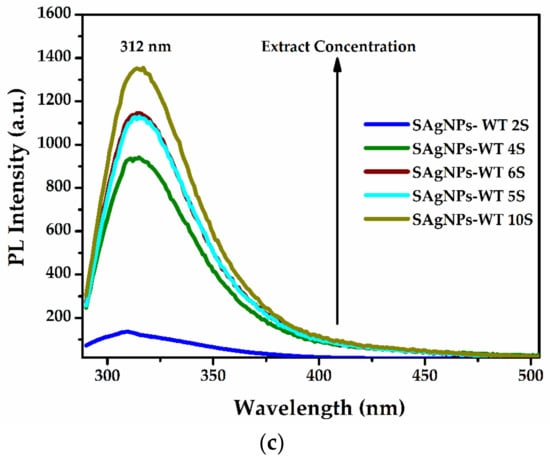 A slight red shift was identified when compared with free tyrosine whose fluorescence is located at λex/λem = 274/310 nm. Furthermore, the PL emission of eight samples of SAgNPs-WT extracted during synthesis at 3–5 min intervals were analyzed and are presented in Figure 6c. The intensity of the 312 nm PL peak shows that the tyrosine concentration significantly increases as a function of reaction time with the increase in extract quantity added during the synthesis. This can be another confirmation of the existence of polyphenolic compounds that exhibit fluorescence and whose fluorescence increases with the formation of silver nanoparticles.