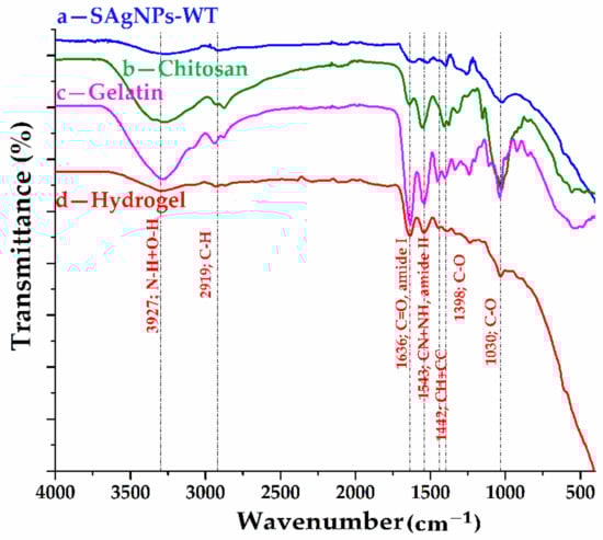 The main structural composition of the raw materials (chitosan, gelatin and silver nanoparticles) and of the hydrogels with silver nanoparticle contents, obtained according to the previously presented biogenic protocol, can be deduced from the FT-IR spectra shown in Figure 7 and the possible assignment of the spectral bands in Table S2.