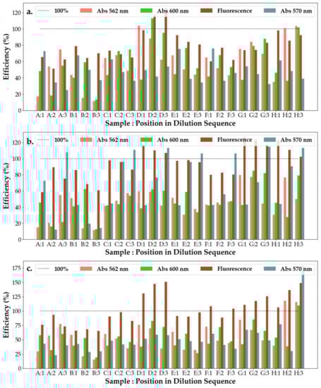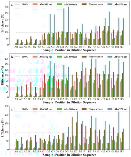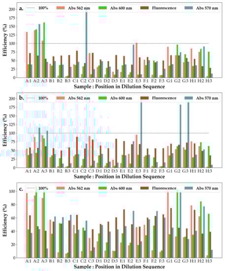 From Figure 11, it can be seen that the ointment efficiency measured using 570 nm excitation increases with the dilution of the substances strongly when interacting with P.a, whereas there was not a significant response to the interaction with the other two cell cultures. With the exception of A and H, the ointment solutions see a decrease in efficiency when measured with 562 nm light, while the efficiency measured with 600 nm light increases when interacting with the S.a cell culture. The opposite is true for solutions A and H. On interacting with E.c, the ointment solutions experience a decrease in efficiency with dilution, whereas all solutions experience variations in efficiency with dilutions without respecting a trend. Across all cell cultures, however, ointment D shows a high efficiency under all light measurements.