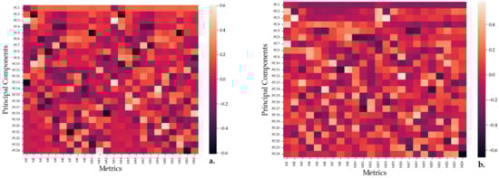 PCA components were mapped until a component explained less than 5% of the variation in data, with the 2D representations of the feature space being shown in Figure S6a for the fluorescent and 570 nm measurements and in Figure S6b for the 562 nm and 600 nm measurements. Moreover, the feature maps for the principal components (PCs) are shown in Figure 9a,b.
