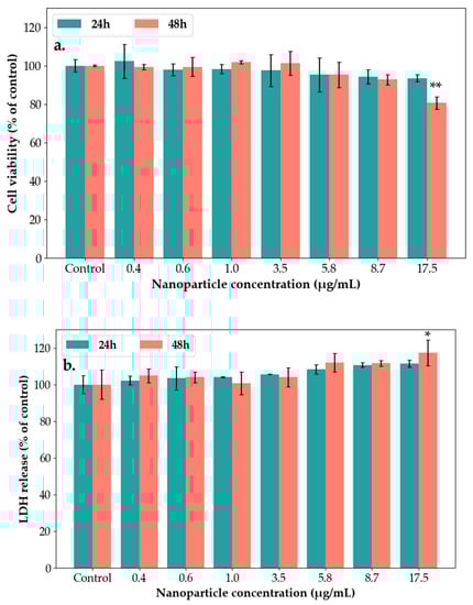 In Figure 12a, the MTT results showed about a 20% decrease after 48 h at 17.5 µg/mL concentrations of NPs compared to the control level. No significant changes were registered for the other concentrations.