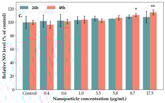 The cytotoxicity of SAgNPs-WT was evaluated by MTT and LDH assays using the HaCaT cell lines (Figure 12a,b). The inflammatory response was analyzed using the Griess method []. At 24 and 48 h, after the exposure of the keratinocytes to different concentrations of NPs (0.4–17.5 µg/mL), the production of nitric oxide from the culture medium was tested, and it is presented in Figure 12c.