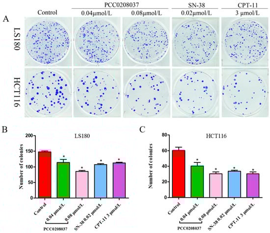 Effects of PCC0208037 on colony formation in CRC cells. (A) LS180 and HCT116 cells were cultured with the indicated concentration of PCC0208037 for 12 days. (B) Number of clones formed by LS180 cells. (C) Number of clones formed by HCT116 cells. The data were expressed as the mean ± SD (n = 3). * p < 0.05 as compared to the control.