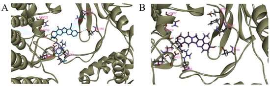 Representation of the binding modes of PCC0208037 (A) and SN-38 (B) with the complex conformation of DNA and Topo I (PDB code:1k4t). Key residues were in gray color and hydrogen bonds were represented with red lines.