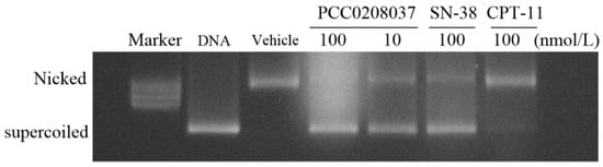 To determine whether PCC0208037 inhibited Topo I activity, a DNA relaxation assay was conducted. In this assay, supercoiled plasmid DNA was relaxed and nicked by recombinant Topo I, while no nicked DNA would be found when the Topo I enzyme was inhibited. CPT-11, as the prodrug of SN-38, showed similar results as a vehicle. In contrast, the bioactive metabolite of the CPT-11 SN-38 treatment led to clear supercoiled DNA, suggesting that Topo I activity was inhibited by SN-38. Similarly, PCC0208037 dose-dependently increased the presence of supercoiled DNA, suggesting that PCC0208037 could inhibit Topo I activity (Figure 4).