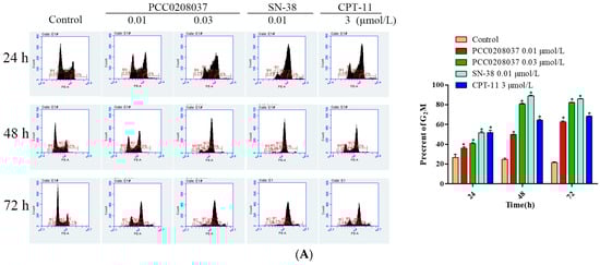 To explore the effect of PCC0208037 on cell cycle progression, LS180 cells were treated with PCC0208037 and then examined by FCM flow cytometry. The treatment with PCC0208037 significantly increased the ratio of the cells in the G2/M phase over 24, 48, and 72 h treatments. Similarly, double staining with FITC annexin V showed that 24, 48, and 72 h treatments with PCC0208037 significantly increased the percentage of apoptotic cells (Figure 5).