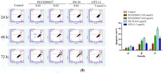 PCC0208037 induced G2/M phase arrest and apoptosis in LS180 cells. (A) Cells were treated with multiple concentrations of PCC0208037 for 24, 48, and 72 h and then analyzed by flow cytometry with PI staining. (B). Cells were treated with multiple concentrations of PCC0208037 for 24, 48, and 72 h and then analyzed by flow cytometry with annexin VeFITC staining. The data were expressed as the mean ± SD (n = 3). * p < 0.05 as compared to the control.