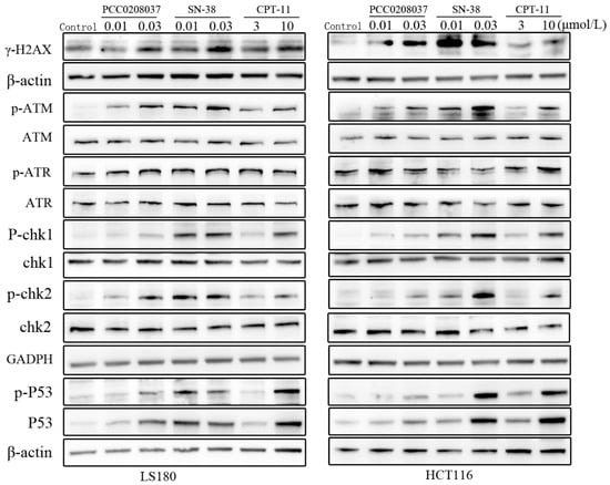 Effects of PCC0208037 on the protein expression levels were examined by Western blotting, as described previously []. Briefly, 2 × 106 LS180 and HCT116 cells were seeded in 10-cm dishes to adhere overnight. Then, the cells were treated with DMSO (final concentration = 0.1%), PCC0208037 (0.01 μmol/L and 0.03 μmol/L), SN-38 (0.01 μmol/L and 0.03 μmol/L), or CPT-11 (3 μmol/L and 10 μmol/L) for 8 or 24 h. At the desired time points, cells were washed twice with a cold PBS. Then, cells were lysed in the RIPA buffer for 30 min on ice. The RIPA buffer contains protease inhibitors and phosphatase inhibitors. After sonication, the samples were centrifuged at 12,000 rpm, and then the supernatants were harvested and assayed for the protein concentration. Equal amounts of protein (30 μg) were separated with a polyacrylamide gel and transferred to a PVDF membrane. The membranes were blocked for 2 h (in 5% skim milk) and then incubated with primary antibodies overnight at 4 °C: ATM p-ATM, ATR, p-ATR, Chk1, p-Chk1, Chk2, p-Chk2, P53, p-P53, Bcl2, gamma H2AX, Bax, Puma, β-actin, and GAPDH. Then, the membranes were incubated with secondary antibodies for 2 h at room temperature. All these antibodies were diluted to a 1:1000 concentration in use. The immunoblots were visualized by a BeyoECL Plus enhanced chemiluminescence system.