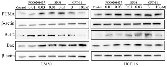 The effects of PCC0208037 on key signaling molecules associated with apoptosis were investigated in LS180 and HCT116 cells (Figure 7). Compared to the control group, 24 h of PCC0208037 treatment significantly up-regulated the protein levels of BAX and PUMA and down-regulated the protein level of Bcl-2.