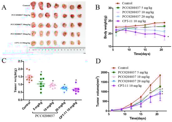 Anti-tumor effect of PCC0208037 in the LS180 xenograft tumor model. (A) Representative tumors removed after the last treatment in each treatment group. (B) Body weight gain curves of mice bearing an LS180 xenograft tumor. (C) Tumor weights in the different groups of mice after 15 d of treatment. (D) Tumor growth curves in mice that received PCC0208037 or CPT-11 treatment. * p < 0.05 as compared to the control.