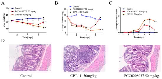 Preliminary toxicological evaluation of PCC0208037 and CPT-11 in mice. (A) Body weight loss induced by PCC0208037 and CPT-11. (B) Food intake reduction induced by PCC0208037 and CPT-11. (C) PCC0208037 and CPT-11 both induced diarrhea during the repeated treatment. (D) H&E staining to visualize paraformaldehyde-fixed sections of the colorectum. * p < 0.05 as compared to the control.