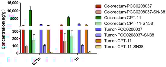 The tissue distribution of PCC0208037 in mice. The colorectum and tumor concentrations of PCC0208037 and its major metabolite, SN-38, in LS180 xenograft tumor mice. The data were expressed as the mean ± SD (n = 3).