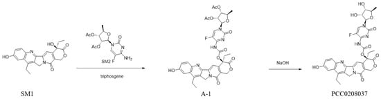 A solution of PCC0208037-1 (3.2 g, 4.3 mmol, and 1.0 eq) in MeOH (50 mL) was added with a 1N NaOH solution (12.9 mL, 12.9 mmol, and 3.0 eq) at 0 °C. The resulting solution was stirred at 0 °C for 2 h. We adjusted the mixture to a PH = 7 with HCl and dried it with Na2SO4. It was concentrated and purified by gel column chromatography (MeOH: DCM = 3:100 to 5:100) to obtain the final 1.1 g yellow solid product of PCC0208037.