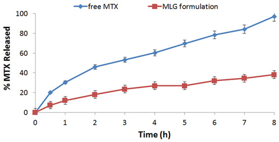Previous research attempts reported effective targeting of MTX via different nanocarrier moieties. MTX was successfully loaded onto stealth liposomes via a thin-film hydration method. The prepared nanolipid vesicles optimized MTX targeting in vivo, and efficaciously enhanced MTX retention in the targeted tissue in comparison to MTX on its own [16]. Moreover, conjugation of MTX to poloxamer by esterification is a novel strategy (p–MTX micelles) that has led to improvements in MTX pharmacokinetics [17].