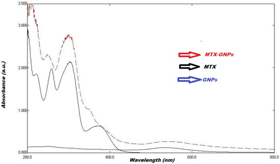 Comparative UV-Vis absorption spectra of free MTX, GNPs, and MTX-GNPs.
