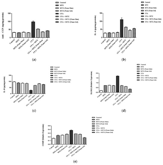 - Each value represents the mean of six experimental rats ± SEM. Statistical analysis was performed using one-way ANOVA followed by the Student–Newman–Keuls multiple comparisons test. a = significantly different from control group at p < 0.05; b = significantly different from MTX group at p < 0.05; c = significantly different from MTX (Nano Soln) group at p < 0.05; d = significantly different from MTX (Nano Gel) group at p < 0.05; e = significantly different from CFA group at p < 0.05; f = significantly different from CFA + MTX group at p < 0.05.