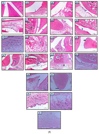 The effects of MTX, MTX-Nano solution, and MTX-Nano gel on histopathological changes were measured. Histopathologic examinations under a light microscope on rats’ knee joints were conducted by routine H&E staining (magnification ×200 and ×100), as shown in Figure 4f. We demonstrated the following findings. 1A: Sections from normal control rats showed a normal articular surface (black arrow) with a normal meniscus (blue arrow). 2A: Knee joint capsule sections showed normal joint articular surface (small arrow) with the normal synovial membrane epithelium (large arrow) that the normal control group showed. 1E: Sections from the CFA-group showed congestion of the vasculature (blue arrow) together with infiltration of inflammatory cells and edema (black arrows). 2E: There was partial organization of the meniscus (blue arrow) together with edema and inflammatory cells at the joint capsule (bent arrow). 3E: Proliferation of the synovial membrane (blue arrow). 4E: Dentation of the synovial membrane (black arrow) edema in the joint capsule (bended arrow). 5E: Proliferation and dentation of the synovial membrane (blue arrow). 6E: Congestion (black), oedema (blue), and lymphocytic aggregation (orange) together with a prolapse of the synovial membrane (violet). 7E: A focal eroded articular surface (blue). 1F: Sections from the CFA + MTX group showed congestion of the vasculature (black) together with mononuclear cell infiltration of the joint capsule (blue), and also proliferation of the articular surface (arrowhead). 2F: Projection of the synovial membrane (blue), congestion (black), and edema (orange). 1G: Sections from the CFA + MTX (Nano Soln) group showing prolapse of the synovial membrane (blue arrow), congestion (black arrow), and edema (orange arrow). 2G: Dentation of synovial membrane (thick arrow) together with edema in the joint capsule (thin arrow), tea red articular surface (thin arrow). 3G: The joint capsule showed edema (bended arrow), congestion (blue arrow), and focal aggregation of inflammatory cells (arrowhead); in addition, prolapse (black arrowhead) and dentation (black arrow) of the synovial membrane could be observed; the articular surface was either normal (orange arrow) or hyper plastic (thin arrow). 1H: Sections from the CFA + MTX (Nano Gel) group showed a prolapsed synovial membrane (thin arrow), and mild partial organization of the meniscus (thick arrow). 2H: Skin showed slight hyperkeratosis (thin arrow). 3H: Dermal skin showed proliferation of the fibrous connective tissue in the deep dermis (arrow). 4H: Dermal skin showed lymphocytic infiltration in the derma (arrow).