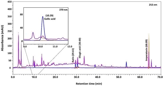 HPLC was performed using Prominence-XR HPLC system (Shimadzu, Japan) equipped with Quaternary pump (Nexera XR LC-20AD XR), DAD detector (SPD-M20 A), Auto-sampler (Nexera XR SIL-20 AC XR), Degassing unit (DGU-20A 5R) and Column oven (CTO-10 AS VP). Separation was achieved using a Shodex C18-4E (5 µm, 4.6×250 mm) column subjected to binary gradient elution. The two solvents used for the analysis were water containing 0.1% acetic acid in water (solvent A) and acetonitrile (solvent B) set in a gradient program (Time (T) = 0: A% = 100%, B = 0%; T = 5: A%= 95%, B = 5%; T = 10: A% = 90%, B = 10%; T = 50: A% = 70%, B = 30%; T =60: A% = 45%, B = 55%; T =70: A% = 20%, B = 80%; T =71: A% = 100%, B = 0%; T =75: A% = 100%, B = 0%). Column temperature was kept 30 °C and flow was set 1.0 mL/min during the analysis. 10 µL of standard and test solutions were injected. Wavelength was set 253 nm (for Rutin, Ellagic acid, and Imperatorin) and 270 nm (for Gallic acid).
