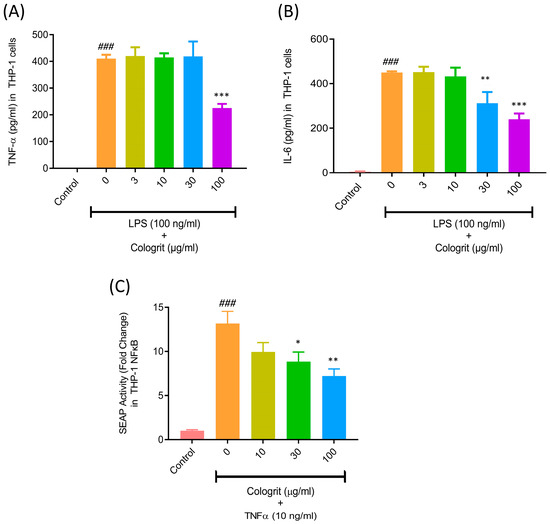 Anti-inflammatory potential of Cologrit formulation in THP-1 cells. Anti-inflammatory activity of the Cologrit formulation was investigated in PMA-transformed THP-1 cells stimulated with LPS (100 ng/mL) through analysis of solubilized pro-inflammatory cytokines (A) TNF-α and, (B) IL-6. (C) NFκB activation and its amelioration by Cologrit formulation was analysed in TNF-α-stimulated THP-1-Blue NFκB reporter cells. All the experiments were performed thrice in triplicate. Statistical analysis was performed using one-way ANOVA followed by Dunnett’s posthoc test. ### p-value < 0.001 (Control versus (vs.) LPS (100 ng/mL) treatment; * p-value < 0.05 (LPS treatment vs. Cologrit + LPS treatment; ** p-value < 0.01 (LPS treatment vs. Cologrit + LPS treatment; *** p-value < 0.001 (LPS treatment vs. Cologrit + LPS treatment).