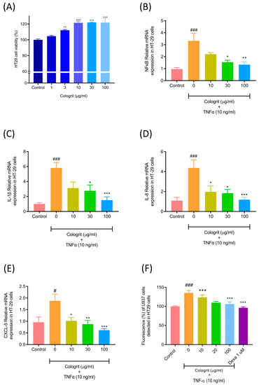 Biocompatibility and anti-inflammatory potential of Cologrit formulation in HT-29 cells. (A) Cell viability analysis was used to determine the dose response of the Cologrit formulation in HT-29 cells. The anti-inflammatory activity of Cologrit formulation was investigated in HT-29 cells stimulated with TNF-α (10 ng/mL) and pre- and co-treated with Cologrit formulation by measuring mRNA expression of (B) NFκB, (C) IL-1β, (D) IL-8, and (E) CXCL5. (F) The effect of TNF-α stimulation on adhesion molecule formation on the surface of HT-29 cells, as well as its amelioration by Cologrit, was studied by measuring fluorescence intensity of Calcein-AM dye-tagged human myeloid leukemia (U937) cells attached on the surface of HT29 cells. All the experiments were performed thrice in triplicate. Statistical analysis was performed using one-way ANOVA followed by Dunnett’s posthoc test. (A) ** p-value < 0.01; *** p-value < 0.001 (Control versus (vs.) treatment). (B–F) # p-value < 0.05 (Control vs. TNF-α (10 ng/mL) treatment; ### p-value < 0.001 (Control vs. TNF-α (10 ng/mL) treatment; * p-value < 0.05 (TNF-α (10 ng/mL) treatment vs. Cologrit + TNF-α (10 ng/mL) treatment; ** p-value < 0.01 (TNF-α (10 ng/mL) treatment vs. Cologrit + TNF-α (10 ng/mL) treatment; *** p-value < 0.001 (TNF-α (10 ng/mL) treatment vs. Cologrit/ Dexa (1µM) + TNF-α (10 ng/mL) treatment).