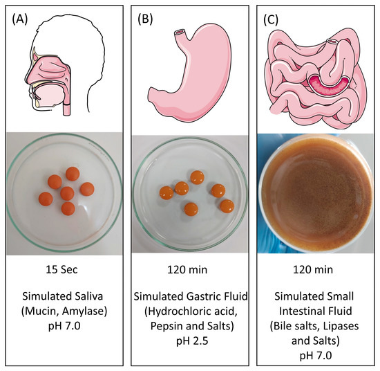EC Cologrit tablets were subjected to in vitro gastrointestinal digestion, which included passing through the mouth (15 s), stomach (2 h), and intestine (2 h) [47]. The EC tablets did not show any evidence for the EC solubilization, or cracking in mouth or stomach phases (Figure 4A,B). In the intestinal phase, the MMA-coating ruptured within 20 min of treatment exposing the tablet interior causing a complete dissolution within 120 min (Figure 4C).