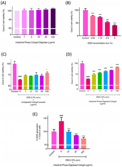 Biological activity of the intestinal phase solubilized EC Cologrit tablets. (A) Biocompatibility analysis of intestinal phase EC Cologrit tablet digestae done on Caco-2 cells, (B) dose range screening of dextran disodium sulfate (DSS) in Cac-2 cells performed using cell viability analysis, (C) protection against loss of cell viability by undigested EC Cologrit tablet in Caco-2 cells treated with 2.5% (w/v) DSS treatment, (D) protection against loss of cell viability by EC Cologrit tablet digestae in Caco-2 cells treated with 2.5% (w/v) DSS treatment, (E) protection against oxidative stress via ROS generation by EC Cologrit tablet digestae in Caco-2 cells treated with 2.5% (w/v) DSS treatment. Statistical analysis was performed using one-way ANOVA followed by Dunnett’s posthoc test. (B) *** p-value < 0.001 (Control versus (vs.) DSS treatment). (C–E) ### p-value < 0.001 (Control vs. DSS (2.5% w/v) treatment; * p-value < 0.05 (DSS (2.5% w/v) treatment vs. Cologrit + DSS (2.5% w/v) treatment; *** p-value < 0.001 (DSS (2.5% w/v) treatment vs. Cologrit + DSS (2.5% w/v) treatment).