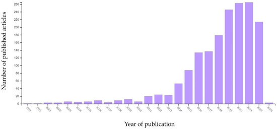 The following data were collected after a careful review of currently available studies in the literature. The research was carried out by consulting different sources, including the Elsevier’s database Scopus [27] and Web of Science [28] using the search terms “3D printed microfluidic devices”, “drug delivery systems”, “nanomedicine”, and “microfluidic lab-on-a-chip”. Figure 1 depicts the growing trend of these topics according to the keywords “3D printed microfluidics”. It is worth noting that the number of scientific publications in these areas began to rise rapidly in 2014, and by 2018, there were three times as many as in 2014. Here, to focus the review on the most recent scientific findings, the last five years of scientific outcomes were reported.