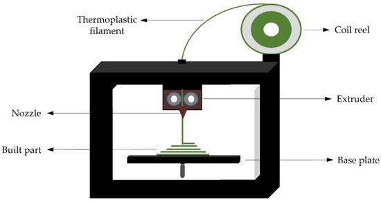 FDM, also known as fused filament fabrication (FMM), is a 3DP method based on the use of a thermoplastic filament unrolled from a spool and pushed toward an extrusion head (including one or more extrusion nozzles) and drive wheels, which are required to keep the flow controlled [81]. The heater in the liquefier head is responsible for melting the filament to a semi-liquid state before extruding it through the nozzle to the printing area to manufacture the actual component [73]. The head may be manipulated horizontally and vertically by a numerical control system that follows a software-defined path [81]. The most crucial objective in this procedure is to fuse the successive layers before solidifying, since solidification before fusion might have a bigger influence on the other characteristics of the building portion [73,82]. A schematic set-up of a simple FDM printer is shown in Figure 3.