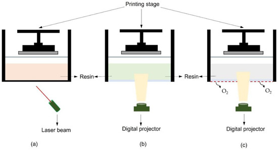 Depending on the arrangement, DLP printers can be bottom-up or top-down equipped. Regarding the bottom-up shape, the moveable head is immersed inside the vat, allowing the resin to be irradiated from the underneath-placed UV-source [89]. This is possible due to the presence of a transparent vat bottom. A thin coating of resin is cured and remains attached to the head between the construction stage and the bottom of the vat. After the fixed polymerization time, the vertical movement of the head allows fresh resin to be put at the bottom of the vat for the next layer to be cured. In the top-down set-up, the photoinitiator is placed above and it radiates the resin in which the building stage is immersed [89]. After curing the first layer, the head travels lower, allowing fresh resin to be deposited on the plate’s surface for polymerizing the next layer. Both arrangements ensure the movement of the head in the vat, so that the amount of resin between the building stage and the photoinitiator is identical to the desired layer thickness [78,79].