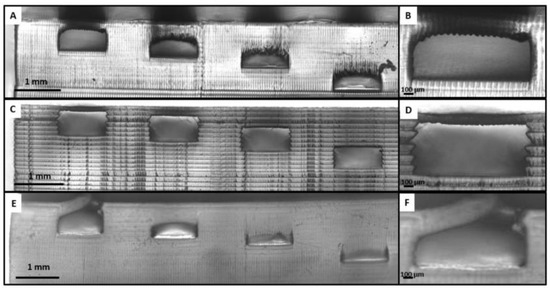 Images of the DLP 3D printed devices by Subirada et al. [99] using Detax (A,B), Asiga (C,D), and Keyprint (E,F) resins.