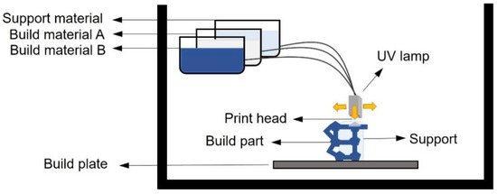 Inkjet 3D printing is a method that involves photopolymer-based and powder-based approaches. In this field, the most promising method associated with MF is photopolymer jetting, also known as the multiJet modelling (MJM) technique [80]. This a 3DP facility that exploits the jet of an acrylate–photopolymer upon a sacrificial support. Once the polymer is placed, each layer is cured by an UV light before next deposition. The great potential of this technique relies in the possibility of using several different materials in the same printing process without the need for additional assembly [75,76].