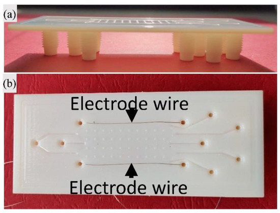 Images of μFFE device produced by Barbaresco et al. [109]: (a) image of 3D-printed device; and (b) image of 3D-printed μFFE device after the electrode insertion.