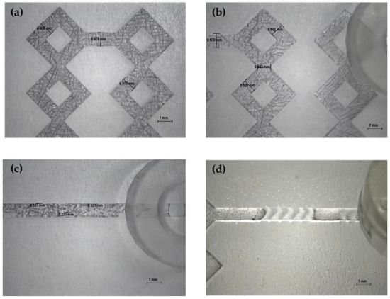 Mader et al., described the creation of MF devices in polystyrene (PS), a polymer never before investigated in FDM. They established the viability of employing a thermoplastic polymer that is widely used in industry but is hardly utilized in AM. The authors achieved artefacts with channels with different geometries (Tesla-like micromixer and cascade mixer) of less than 600 μm within one hour (Figure 4). Furthermore, to achieve high transparency, a strategy was used that consisted of printing the microchannels directly onto PS substrate. UV/Vis analysis demonstrated that the devices had a transmission of over 50% in a range of 400–750 nm, showing good visual clarity. In addition, cell plate-like objects were printed, and cytocompatibility studies performed on them highlighted that PS has a huge potential in biological applications, as the industrially relevant materials could be exploited quickly and efficiently using the existing 3DP technology [88].