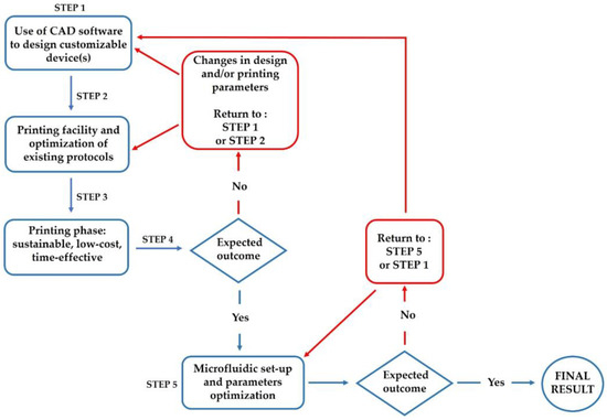 Current fabrication techniques for MF-based devices use typical cleanroom technology to avoid dust or other particulate deposition inside microchannels [26]. For example, glass devices are produced by wet etching, including procedures such as micro-machining, micro-milling, casting, hot embossing, and injection moulding [41,46]. These treatments result in resource-intensive and time-consuming processes, taking into account the additional devices’ integrations and time-consuming processes [69]. Manufacturing constraints are impeding the market launch of MF-based products, as is evidenced by their increasing relevance. This limitation has prompted the MF and analytical communities to investigate additive manufacturing (AM) as an alternative method for fabricating such devices, particularly now that 3D printers are more widely available [70].