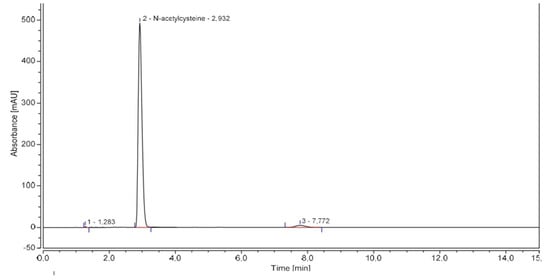 Linearity of HPLC-UV standard curve for NAC was determined with seven concentrations ranging from 125 to 1500 µg·mL−1 prepared in sextuplicate. Linearity was proved between 250 and 1500 µg·mL−1 (R2 > 0.99 and deviation < 10% for each concentration). Repeatability, intermediate precision, accuracy, and uncertainty were determined at three levels of concentration 450 µg·mL−1, 500 µg·mL−1 and 550 µg·mL−1 corresponding to the level of theoretical dilution and the conformity margins (±10%). A robustness study was also conducted with slight variations on several parameters (mobile phase composition and pH, flow, wavelength and column). pH increase of mobile phase and column furnisher were shown to have an influence on reliability of the results (%RSD > 2.0%). A chromatogram of a 500 µg·mL−1 NAC solution is showed in Figure 1 and results are reported in Table 1 and Table 2.